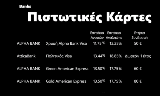 Η εφαρμογή σας ενημερώνει για τα επιτόκια πιστωτικών καρτών (αγορών και αναλήψεων μετρητών), ετήσιες συνδρομές, για τα επιτόκια Καταναλωτικών Δανείων, Στεγαστικών Δανείων, τα Επιτόκια Euribor (εβδομάδας,μηνός κ.λ.π.).