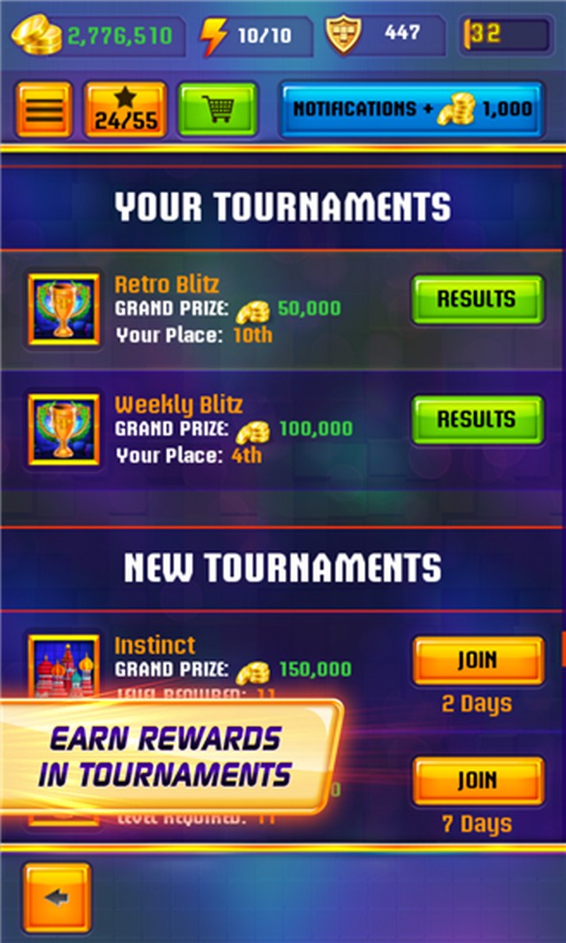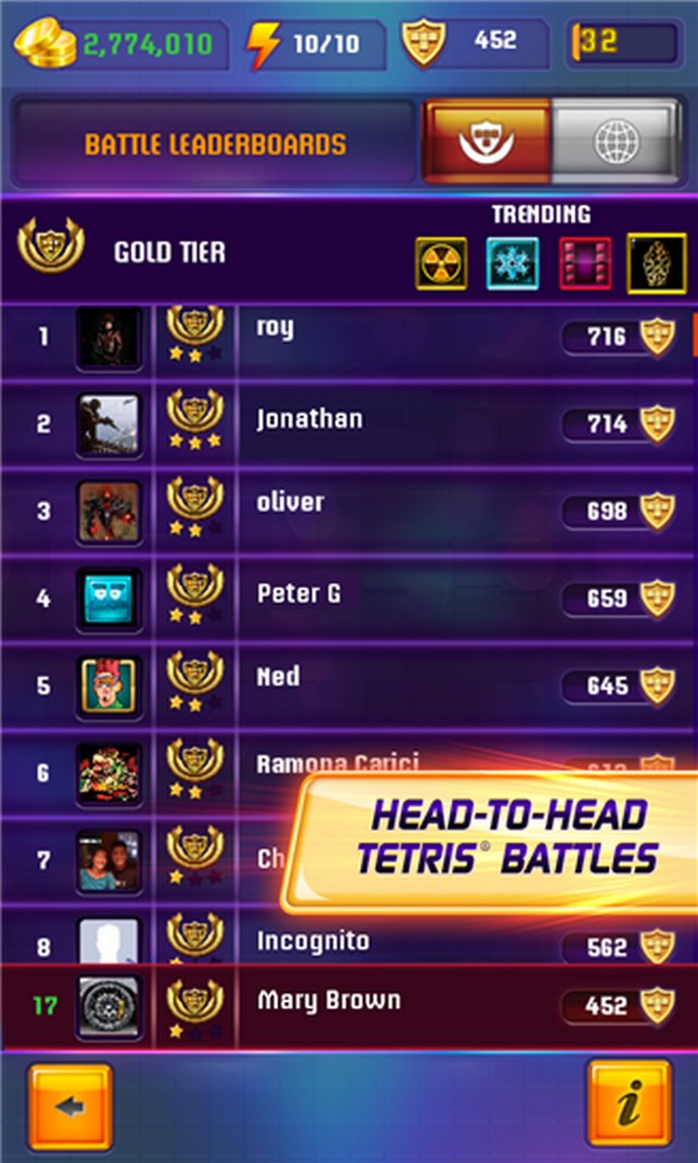 Κερδίστε μετάλλια μέσα από μάχες και περάστε βαθμίδα, έτσι ώστε να βρεθείτε στον παγκόσμιο πίνακα με τους κορυφαίους παίκτες! Το Tetris Blitz αποτελεί κομμάτι του κλασσικού παιχνιδιού “tetris”, αλλά σε μια πιο ανταγωνιστική έκδοση.