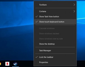 Θα πρέπει να κάνετε δεξί «κλικ» στη μπάρα εργασίας και να φροντίσετε η επιλογή Show touch keyboard button (Εμφάνιση πλήκτρου πληκτρολογίου αφής) να είναι ενεργοποιημένη. Μία σχετική ένδειξη θα εμφανιστεί στις ειδοποιήσεις σας, στην κάτω δεξιά γωνία της μπάρας εργασίας. Δεν χρειάζεται παρά ένα πάτημά του και το πληκτρολόγιο των Windows θα εμφανιστεί στην οθόνη σας.