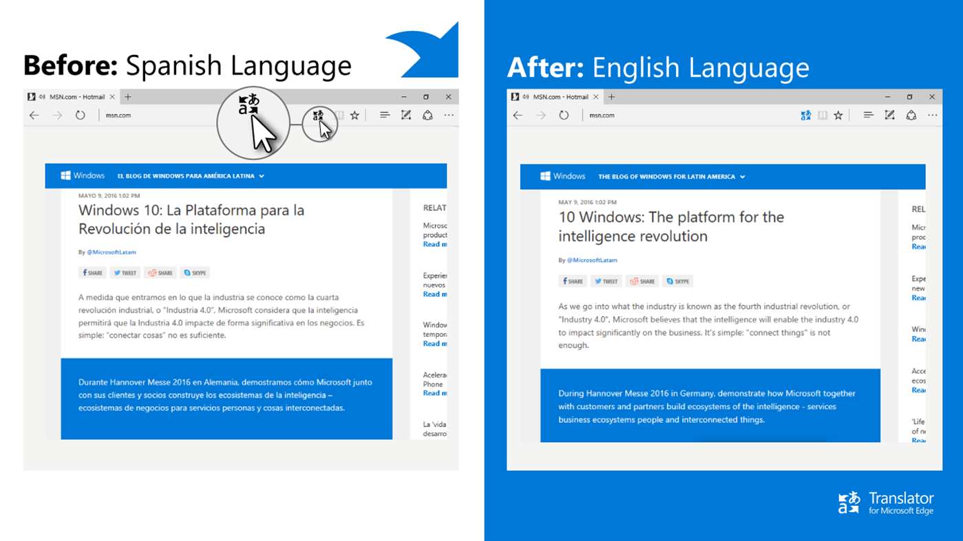 Αναζητήστε το εικονίδιο του Μεταφραστή της Microsoft στη γραμμή διευθύνσεων όταν επισκέπτεστε μια ιστοσελίδα ξένων γλωσσών. Κάντε κλικ στο εικονίδιο για να μεταφράσετε αμέσως την ιστοσελίδα στην προτιμώμενη γλώσσα σας. Μπορείτε επίσης να επιλέξετε το κείμενο, που θέλετε να μεταφράσετε και να κάνετε δεξί κλικ για να κάνετε μεταφράσεις in-line.
