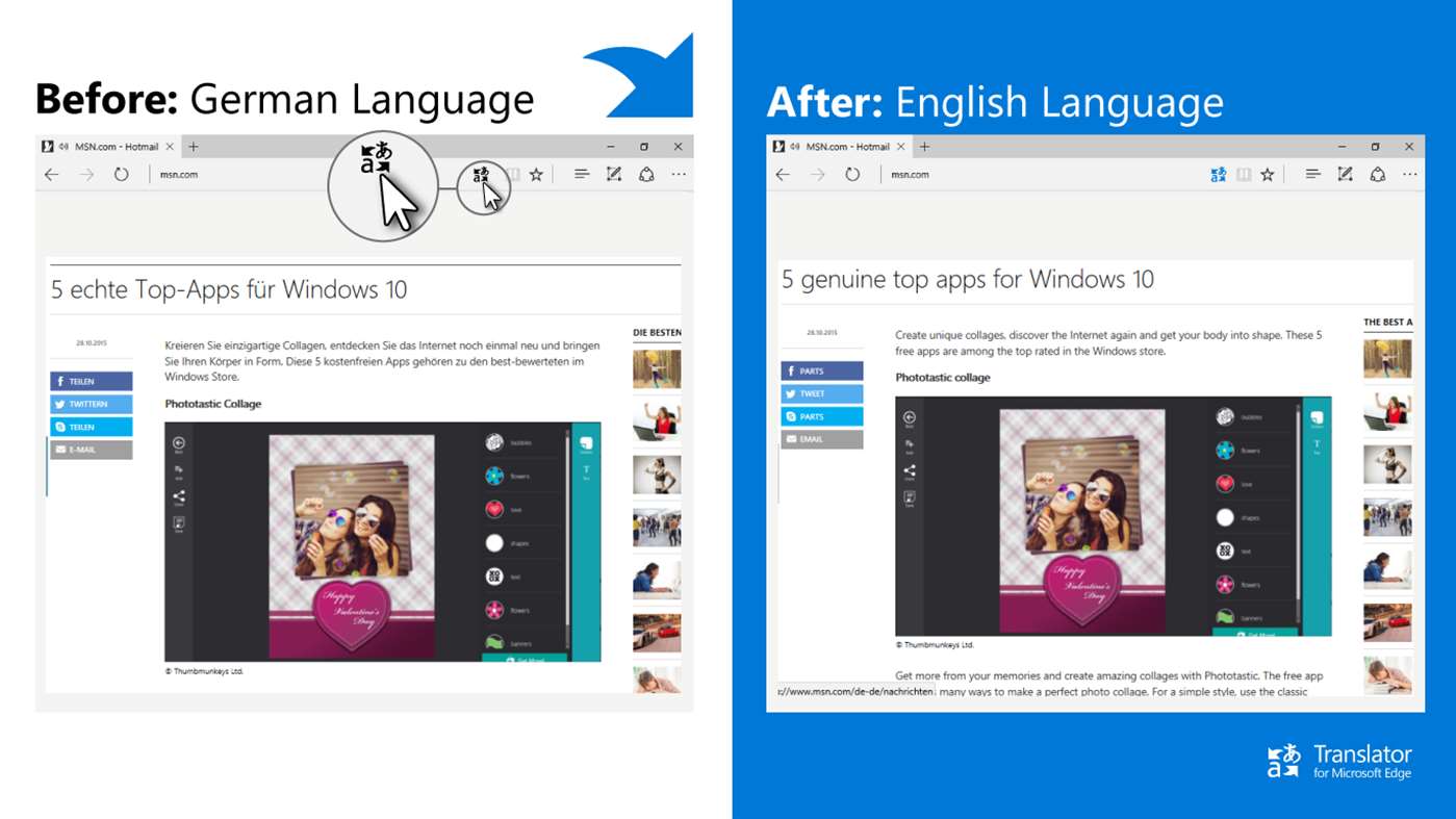 Με την εφαρμογή Translator for Microsoft Edge, μπορείτε να μεταφράσετε ιστοσελίδες ξένων γλωσσών και κείμενα σε περισσότερες από 50 γλώσσες.