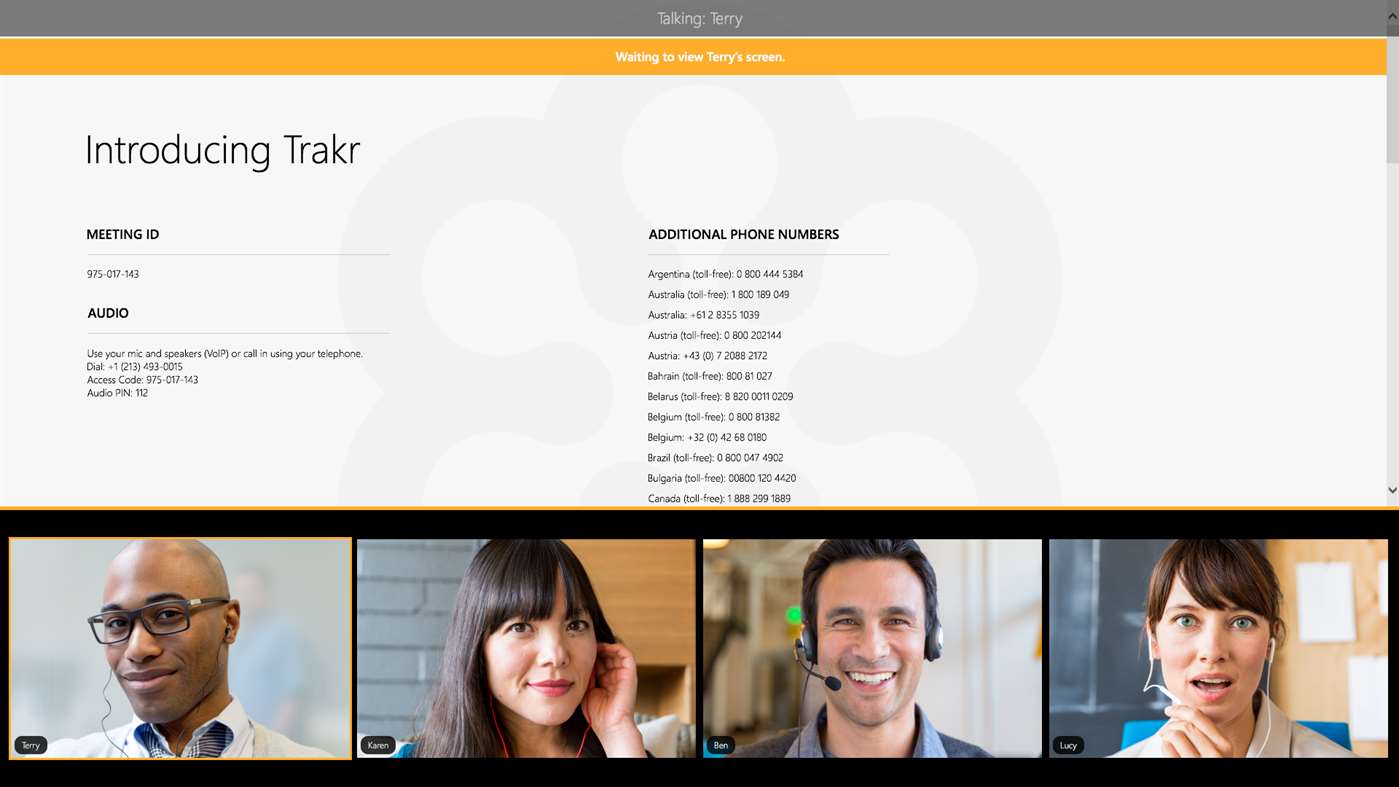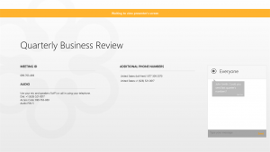 Προβάλετε και παρουσιάστε παρουσιάσεις διαφανειών, μακέτες σχεδιασμού, υπολογιστικά φύλλα και  αναφορές με όσους παρουσιαστές συνεδριάσεων επιλέγουν να μοιραστούν την οθόνη και να επικοινωνήσουν μέσω της ενσωματωμένης σύνδεσης ήχου ή τηλεφώνου στο διαδίκτυο.