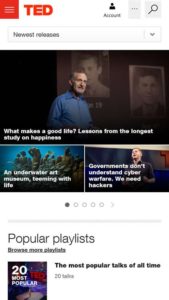 Η επίσημη εφαρμογή της TED παρουσιάζει συνομιλίες από μερικούς από τους πιο συναρπαστικούς ανθρώπους του κόσμου: εκπαιδευτικούς ριζοσπάστες, ιδιοφυίες, ιατρικούς αγώνες, επιχειρησιακούς γκουρού και μουσικούς θρύλους.