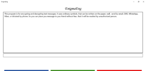 Με την εφαρμογή EnigmaEng τα συνηθισμένα σύμβολα μπορούν να χρησιμοποιηθούν για να γραφτούν στο χαρτί, στον τοίχο, να στείλουν με email, SMS, WhatsApp, Viber ή σε υπαγορευμένα τηλεφωνικά. Έτσι μπορείτε να στείλετε μήνυμα σας σε κάποιο φίλο χωρίς φόβο, ότι θα διαβαστεί από ένα μη εξουσιοδοτημένο άτομο.