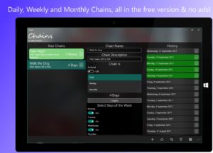 Καθώς και καθημερινά, το Chains by Valley Software σάς επιτρέπει να ορίζετε εβδομαδιαίες και μηνιαίες αλυσίδες.