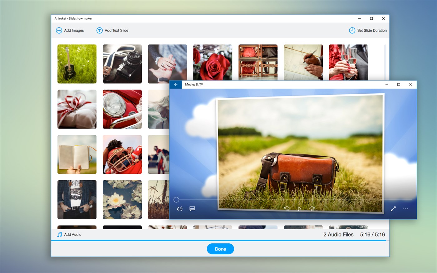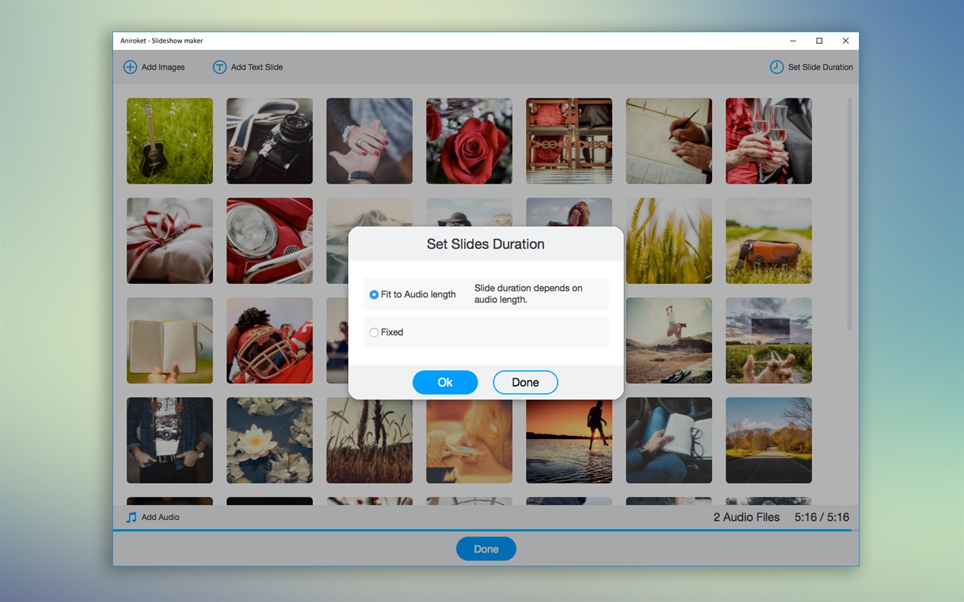 Απλώς προσθέστε τις διαφάνειες και τα κομμάτια ήχου που σας αρέσουν – τα υπόλοιπα δημιουργούνται αυτόματα. Η διάρκεια του βίντεο είναι ευέλικτη και εξαρτάται από τη διάρκεια του ήχου – Το Aniroket θα ρυθμίσει αυτόματα τη διάρκεια της διαφάνειας, ώστε να έχετε ένα καταπληκτικό βίντεο.