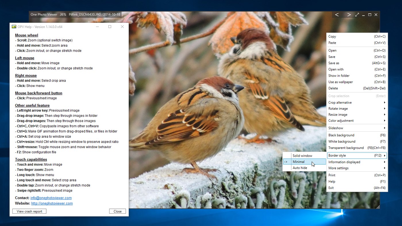 Το One Photo Viewer έχει πολλές επιλογές και δυνατότητες προσαρμογής, όπως προβολή διαφανειών, προσαρμογή χρώματος, περικοπή, αλλαγή μεγέθους, περιστροφή, αντιγραφή/επικόλληση πρόχειρο και πολλά άλλα. Όλα είναι προσβάσιμα με δεξί κλικ μενού ή συντομεύσεις πληκτρολογίου. Είναι επίσης συμβατή με οθόνη αφής.
