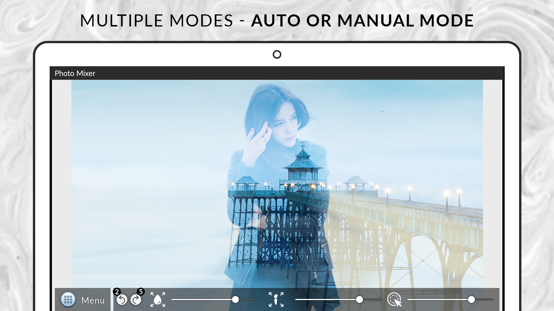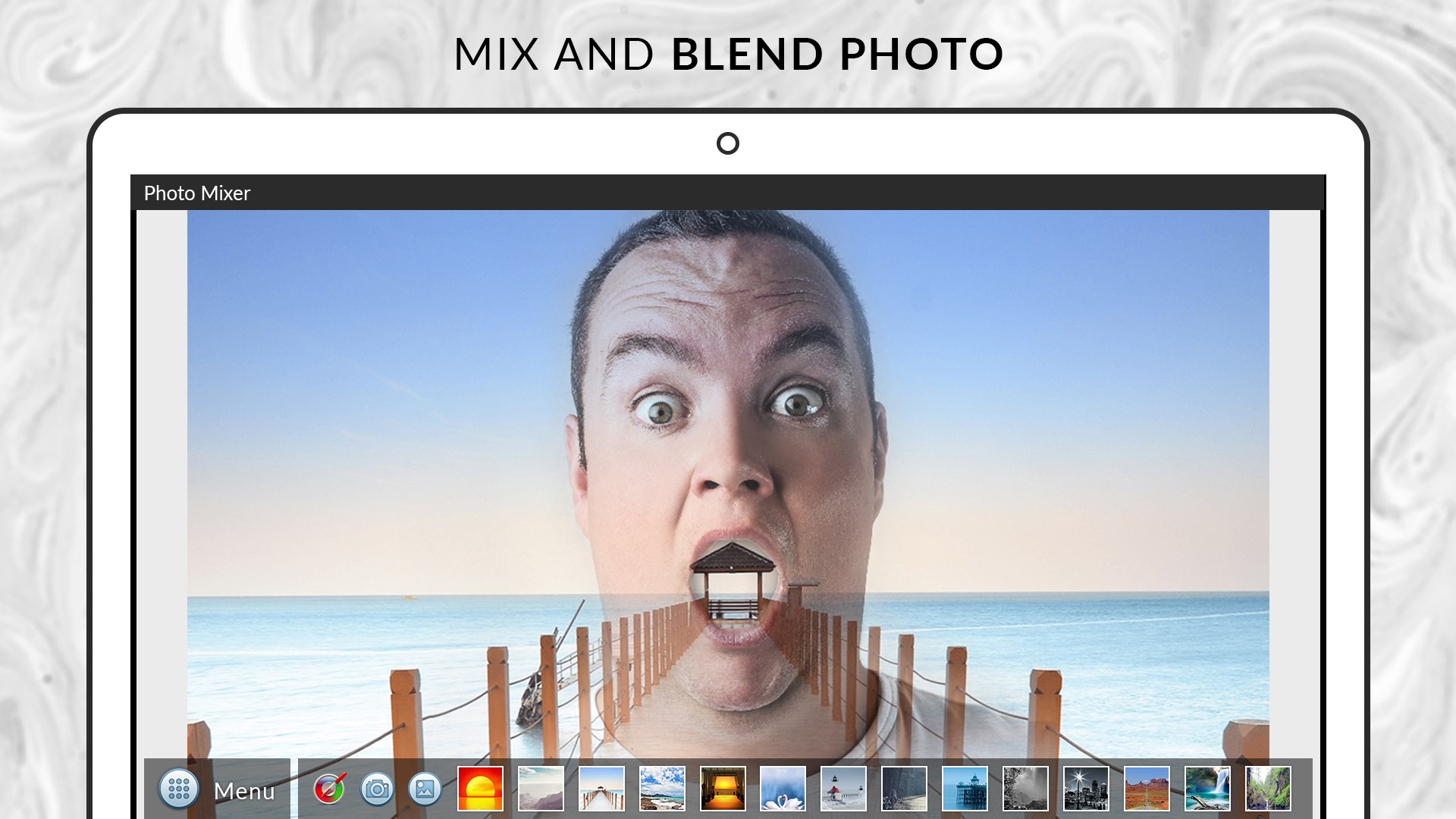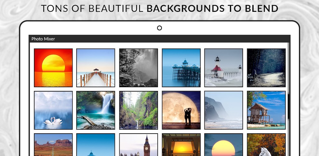 Κάνετε τις κανονικές σας φωτογραφίες πιο ενδιαφέρουσες με ευκολία, απλά επιλέξτε μια φωτογραφία από τη συλλογή σας ή σύρετε από τη φωτογραφική μηχανή και ανακατέψτε αυτήν την εικόνα με την προεγκατεστημένη εκπληκτική συλλογή φωτογραφιών ή επιλέξτε μια άλλη φωτογραφία από τη φωτογραφική μηχανή / γκαλερί και τα συνδυάστε για να πάρετε ένα εκπληκτικό αποτέλεσμα.
