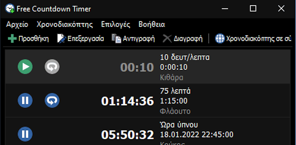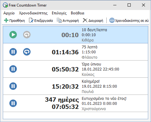 Αυτή η εφαρμογή σάς επιτρέπει να ορίσετε όσα χρονόμετρα αντίστροφης μέτρησης θέλετε.