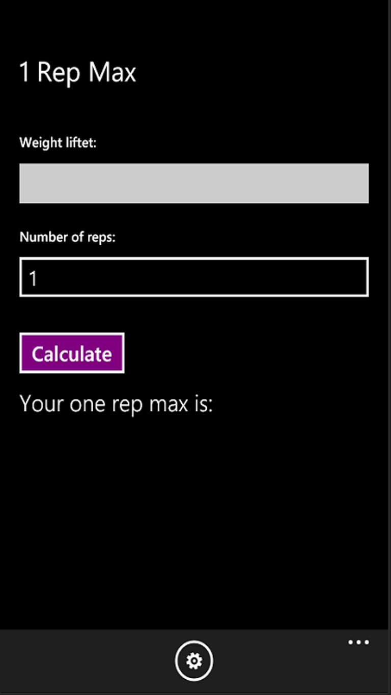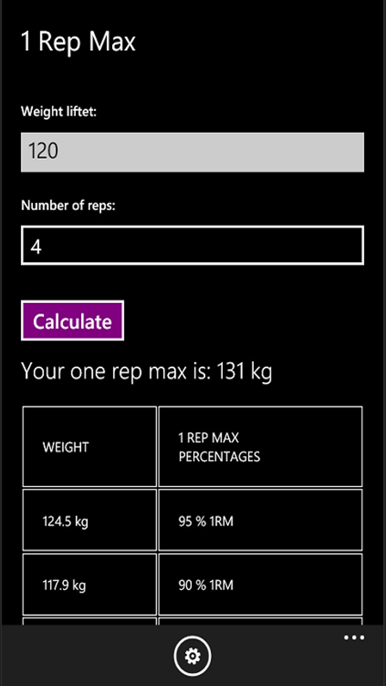 Αυτή η αριθμομηχανή θα σας δείξει! Αυτή η αριθμομηχανή βασίζεται σε έναν τύπο του Matt Brzycki. Απλώς κάντε ένα σετ αποτυχίας σε οποιαδήποτε άσκηση και μετά πληκτρολογήστε πόσα κιλά κάνατε και πόσες επαναλήψεις ολοκληρώσατε (χωρίς βοήθεια). Αυτή η εφαρμογή περιλαμβάνει επίσης έναν πίνακα ποσοστών που σας δείχνει το ποσοστό της μέγιστης.
