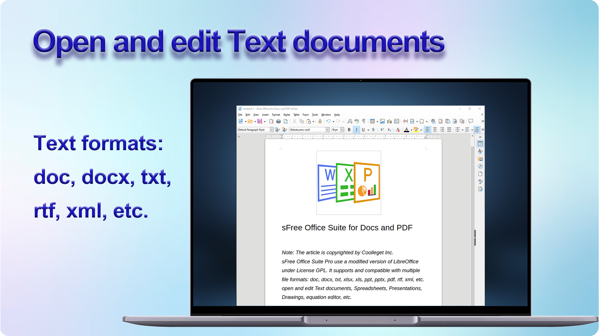 Το sFree Office Suite χρησιμοποιεί τα δυαδικά αρχεία μιας τροποποιημένης έκδοσης του LibreOffice με άδεια MPLv2. Μάθετε περισσότερα σχετικά με αυτό στο πλαίσιο διαλόγου σχετικά με την εφαρμογή. Ο επίσημος ιστότοπος του LibreOffice είναι ο παρακάτω: https://www.libreoffice.org/