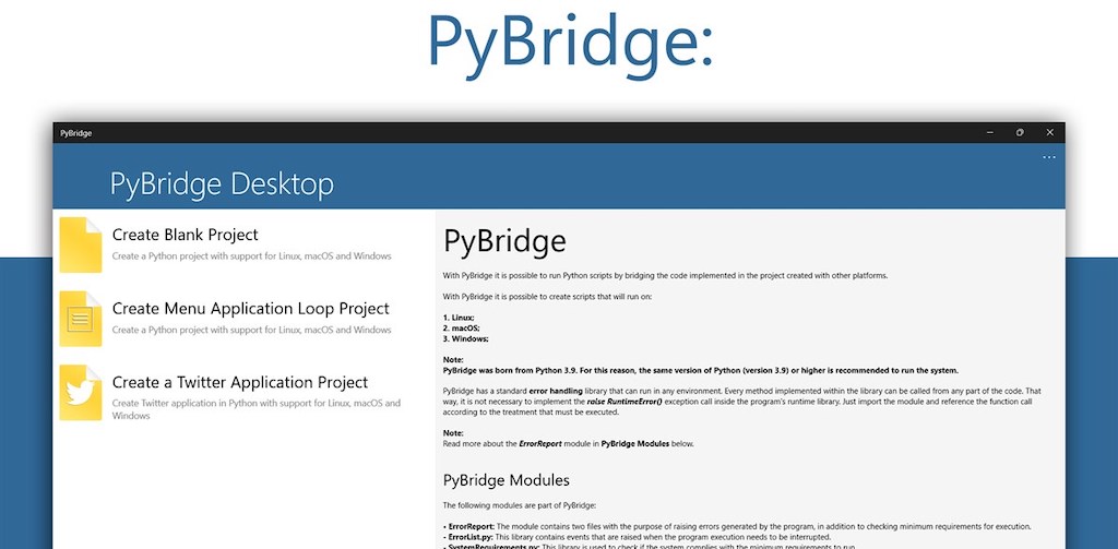 Σημείωση: Το PyBridge γεννήθηκε από την Python 3.9. Για το λόγο αυτό, συνιστάται η ίδια έκδοση της Python (έκδοση 3.9) ή νεότερη για την εκτέλεση του συστήματος.