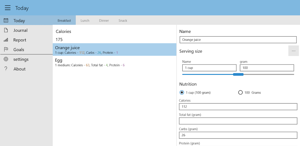 Ο σχεδιασμός είναι βελτιστοποιημένος για να κάνει την είσοδο όσο το δυνατόν πιο γρήγορη, με εισαγωγή 1 κλικ και πρόσφατες προτάσεις για φαγητό. Η ενσωματωμένη βάση δεδομένων έχει ήδη χιλιάδες τρόφιμα και αν τα δικά σας δεν είναι γνωστά, η προσθήκη τους είναι εύκολη.