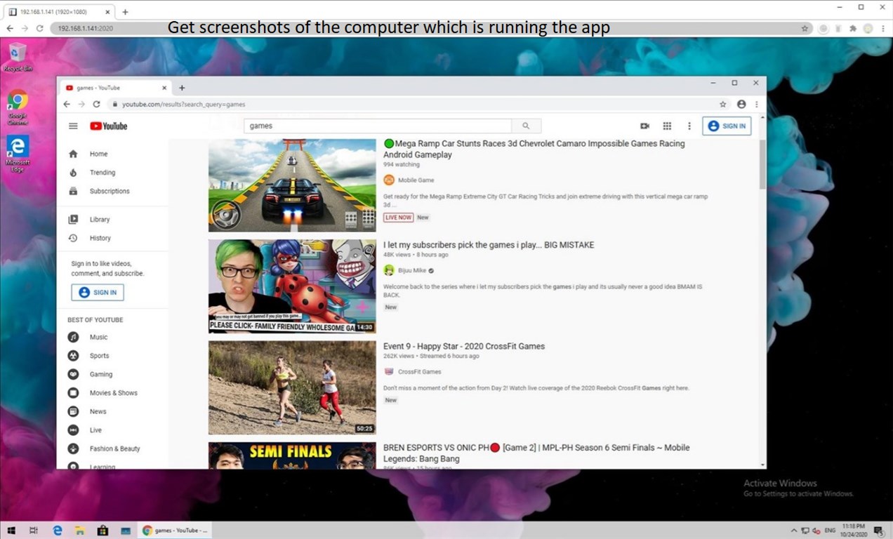 Για παράδειγμα, εκτελέστε αυτήν την εφαρμογή στον υπολογιστή1 και ο υπολογιστής2 είναι συνδεδεμένος στον υπολογιστή1. Με την πλοήγηση στη διεύθυνση https://computer1:2020 σε ένα πρόγραμμα περιήγησης ιστού στον υπολογιστή2, το στιγμιότυπο οθόνης του υπολογιστή1 θα εμφανίζεται στο πρόγραμμα περιήγησης ιστού. Ανανεώστε τη σελίδα για να λάβετε ενημερωμένο στιγμιότυπο οθόνης.