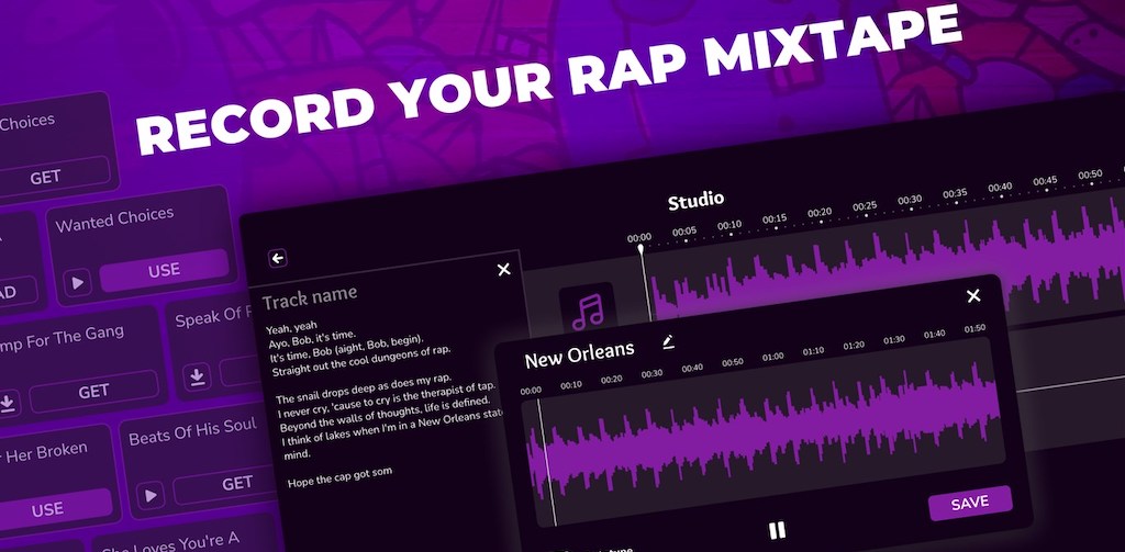 Ηχογραφήστε το ραπ σας με το Mixtape recorder! Επιλέξτε ανάμεσα σε πολλά beats από διάφορα είδη και ξεκινήστε την εγγραφή. Εφαρμόστε αυτόματο συντονισμό και άλλα εφέ για να κάνετε τον ήχο ακόμα πιο δροσερό.