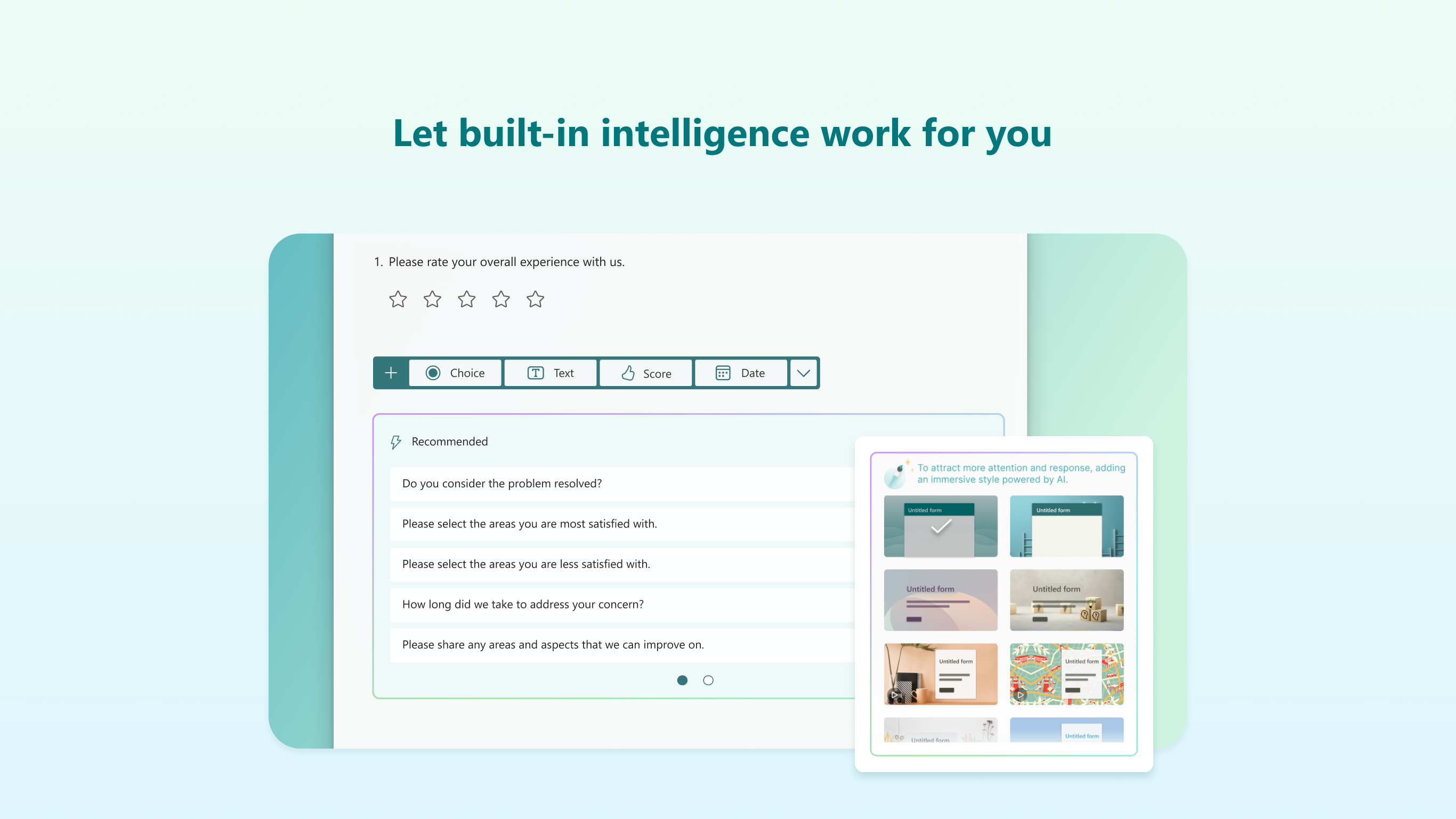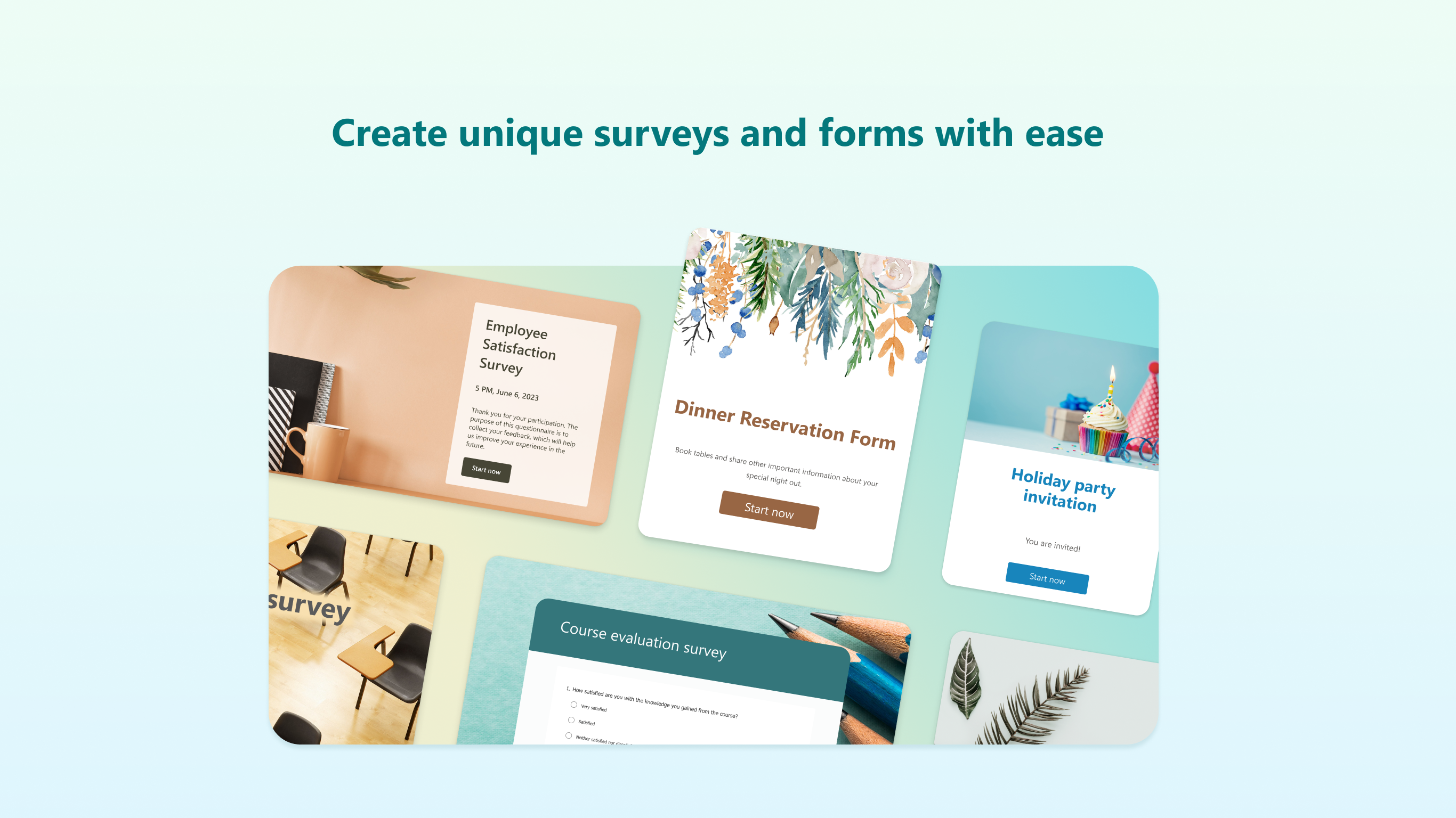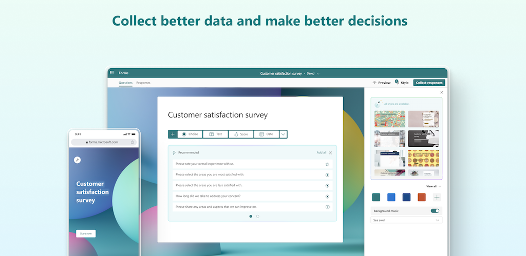 Είτε διεξάγετε έρευνα αγοράς, συλλέγετε σχόλια πελατών ή δοκιμάζετε την πρόοδο των μαθητών, το Microsoft Forms διευκολύνει τη λήψη των πληροφοριών που χρειάζεστε για να λάβετε τεκμηριωμένες αποφάσεις.