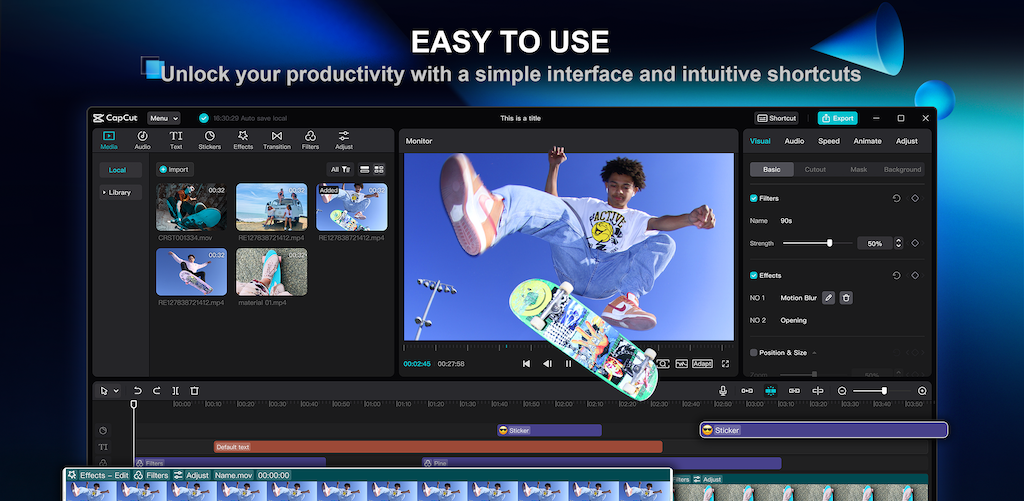 Το CapCut προσφέρει εύχρηστες λειτουργίες επεξεργασίας βίντεο, δωρεάν γραμματοσειρές και εφέ εντός της εφαρμογής, δωρεάν προηγμένες λειτουργίες όπως κινούμενα σχέδια βασικού καρέ, ομαλή αργή κίνηση, πλήκτρο χρώματος και σταθεροποίηση, για να σας βοηθήσει να καταγράψετε και να αποκόψετε στιγμές.