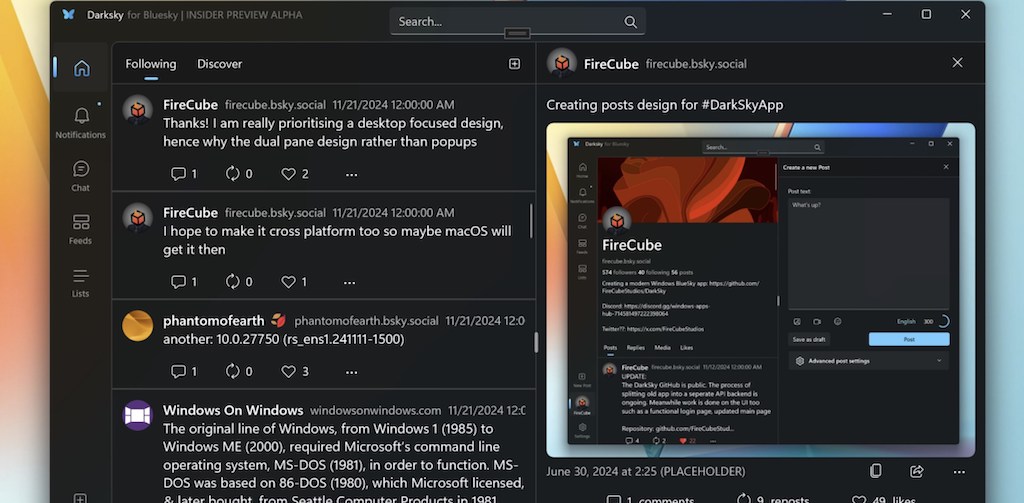 Το DarkSky φέρνει το BlueSky στα Windows με έναν κομψό, μοντέρνο σχεδιασμό, σχεδιασμένο για την καλύτερη εμπειρία χρήστη.