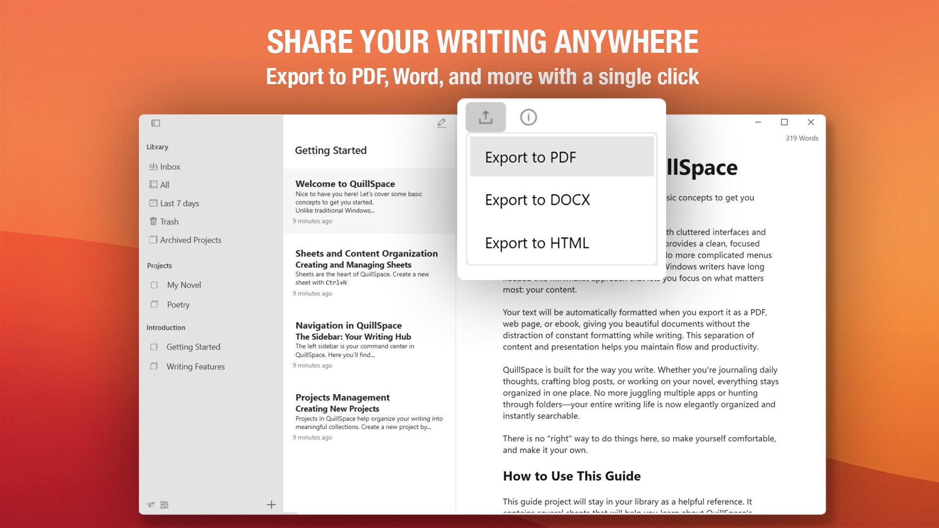 Το QuillSpace είναι η εφαρμογή γραφής που περίμεναν οι χρήστες των Windows – ένα καθαρό, μινιμαλιστικό περιβάλλον γραφής που τοποθετεί τις λέξεις σας μπροστά και στο κέντρο, ενώ διατηρεί ισχυρά εργαλεία οργάνωσης μόλις ένα κλικ μακριά.