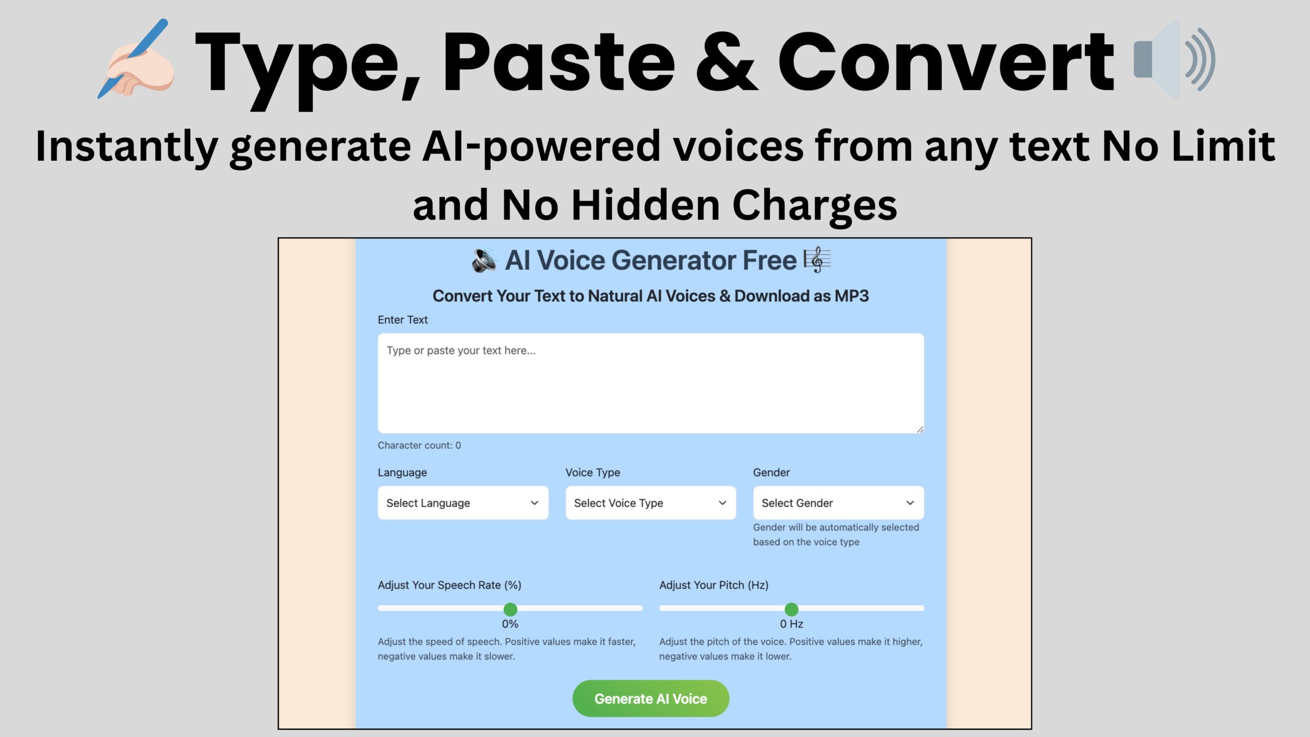 Απελευθερώστε τη δύναμη της τεχνολογίας AI Voice Generator με την εύχρηστη εφαρμογή μας! Είτε χρειάζεστε AI Text to Voice για βίντεο, παρουσιάσεις ή προσβασιμότητα, το AI Voice Maker μας προσφέρει ρεαλιστική ομιλία σε δευτερόλεπτα και όλες οι λειτουργίες είναι εντελώς δωρεάν.