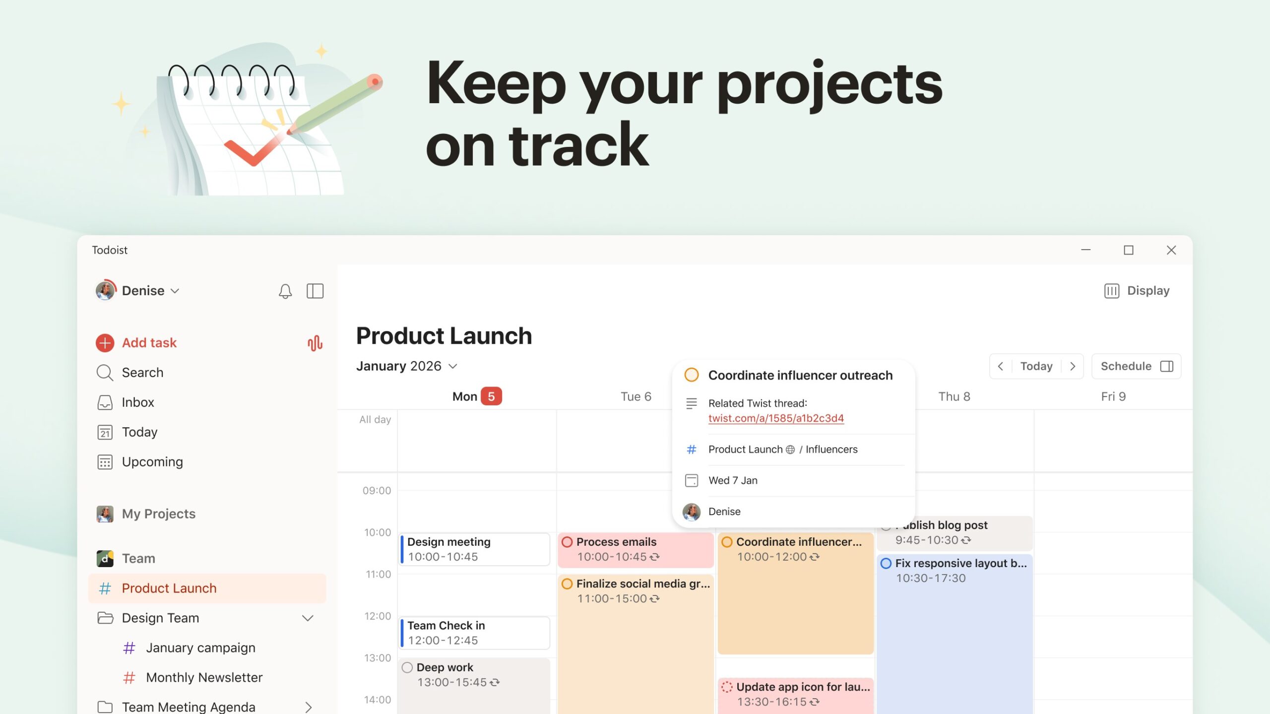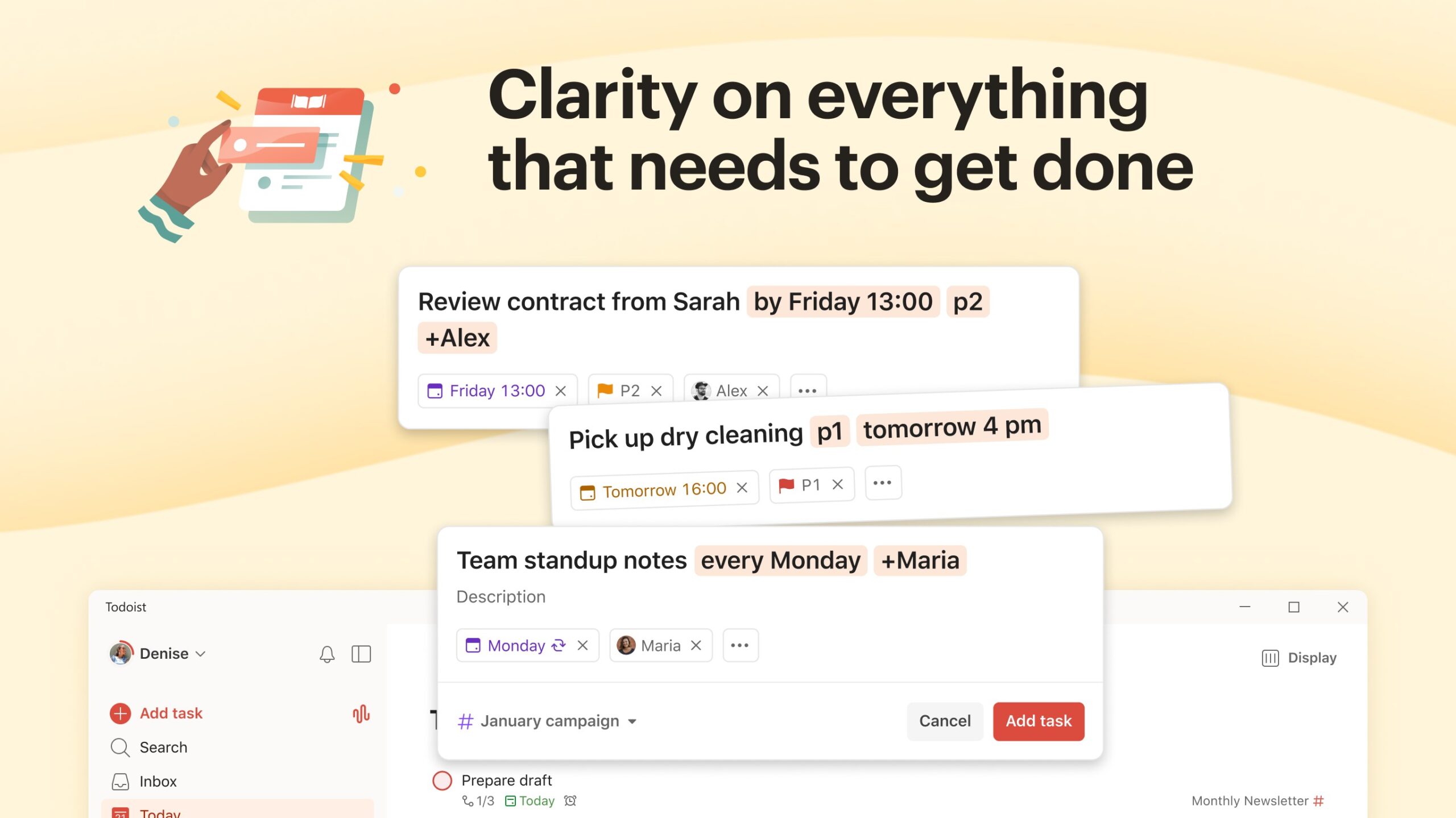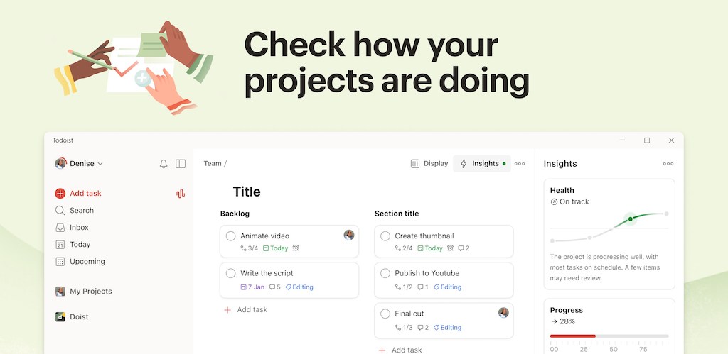 Το Todoist είναι το εργαλείο σχεδιασμού και παρακολούθησης συνηθειών που γεφυρώνει την προσωπική και επαγγελματική παραγωγικότητα, χωρίς τον φόρο πολυπλοκότητας.