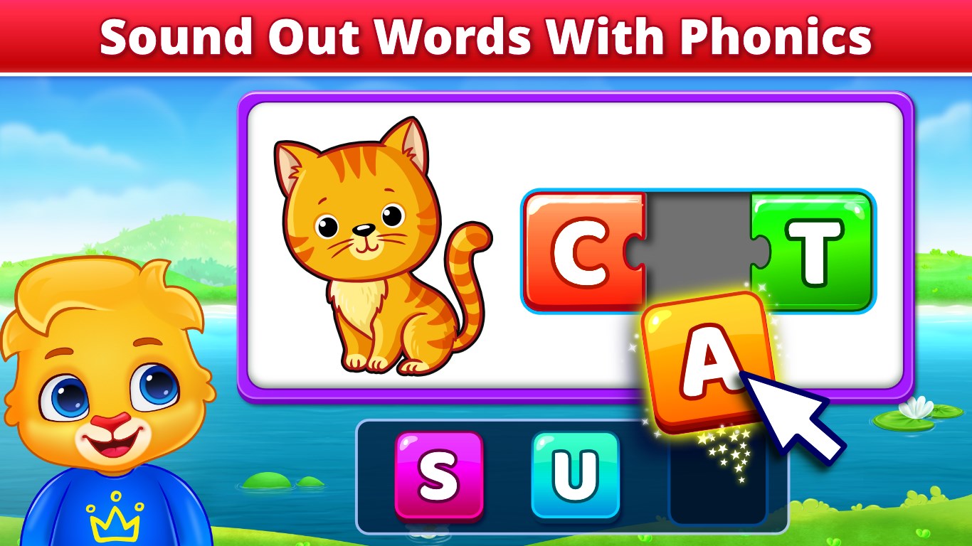 Μια εικόνα εμφανίζεται στην οθόνη με γράμματα ακριβώς από πάνω. Τα παιδιά αντιστοιχίζουν τα γράμματα στην κορυφή επιλέγοντας από τα πλακίδια παρακάτω, τοποθετώντας τα στη σωστή σειρά για να γράψουν λέξεις.